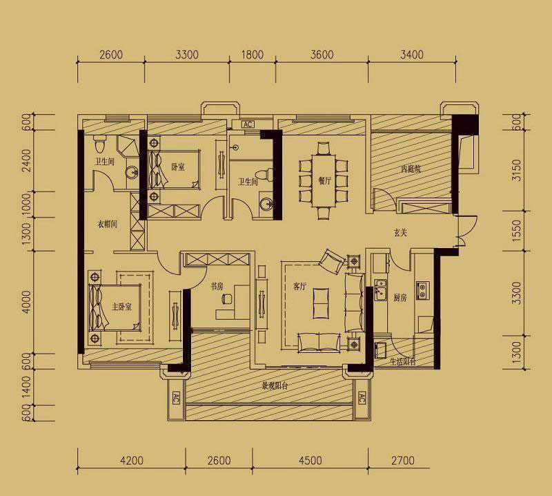 • 依云天汇B01户型 3室面积155.00平米