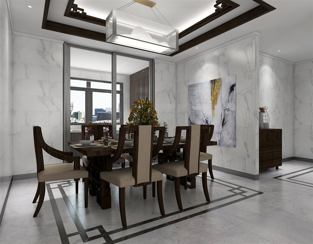 大面积铺贴的白色背景墙优雅脱俗,抽象的挂画增添了几分意境,深褐色的原木餐桌线条简练,与天花相互呼应,让现代家居装饰更具中国文化韵味。