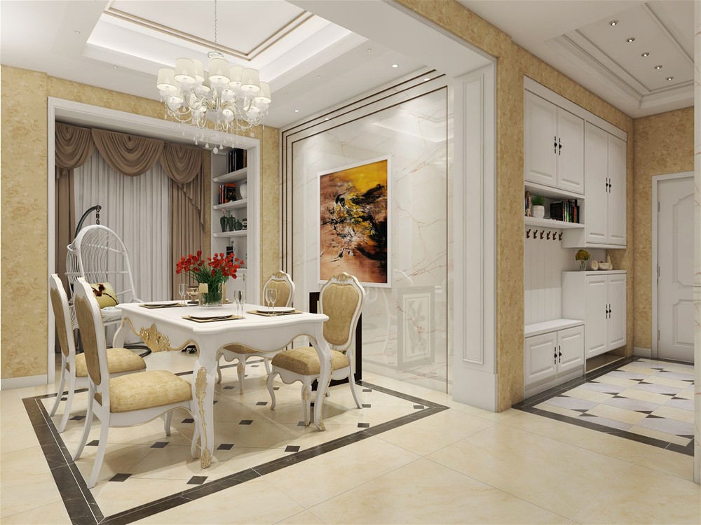 开放式的餐厅与客厅相连通,中间的走廊让客厅、餐厅区域分明,餐厅矩形餐桌和复古的吊灯组合,天花是简单的雕花,留住了中式韵味注入了新中式的创新元素。