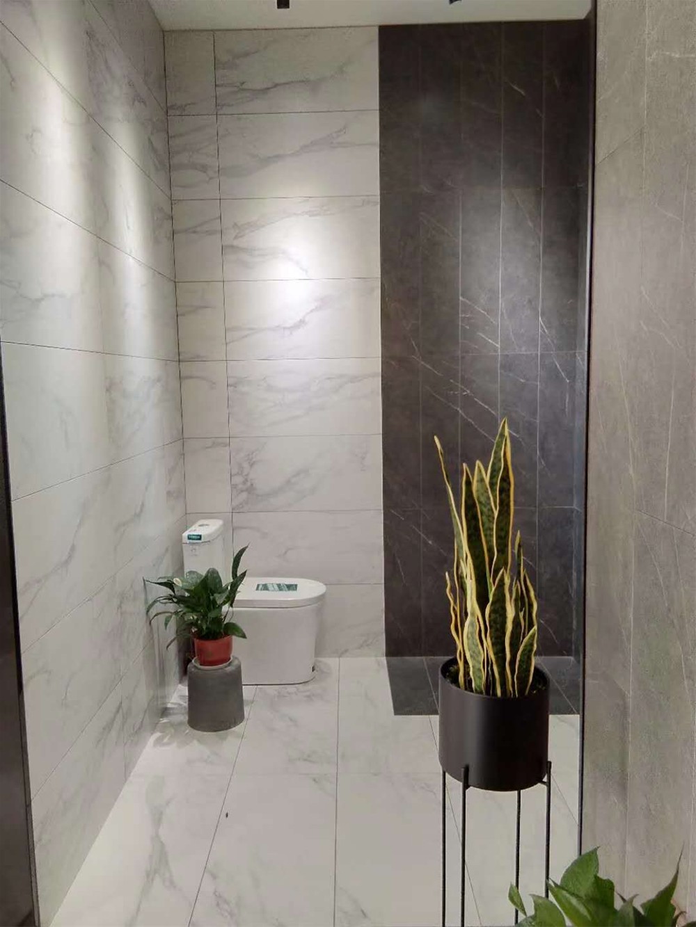这是15°缎光釉铺设的现代风格模拟间,没有更多造型,简单的瓷砖切割铺贴,优雅大气的瓷砖纹理运用错位铺贴而成的墙面。