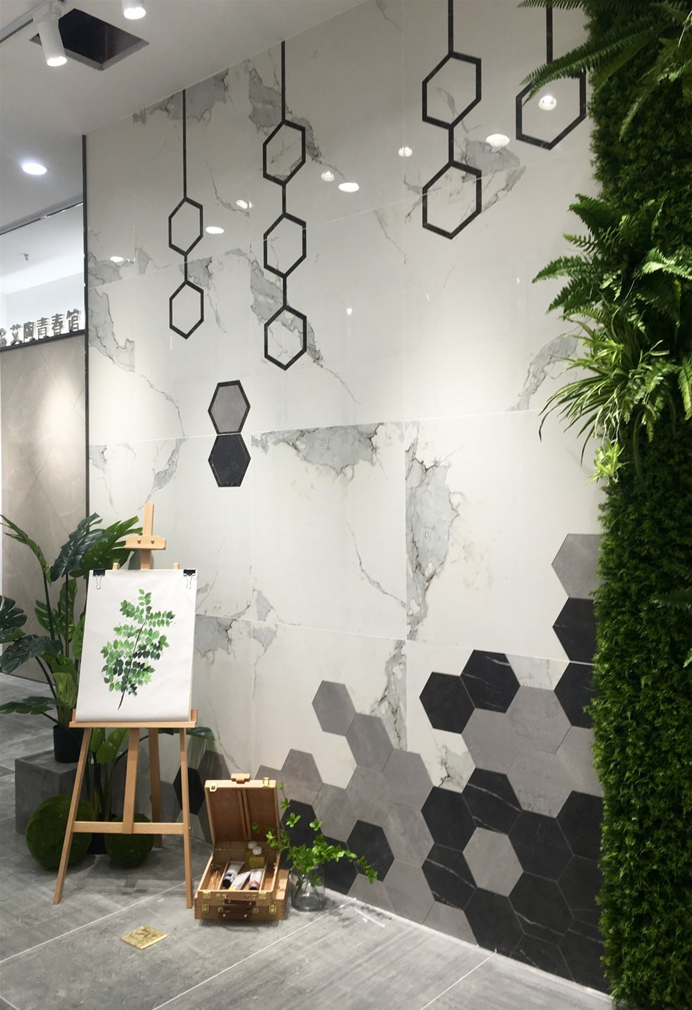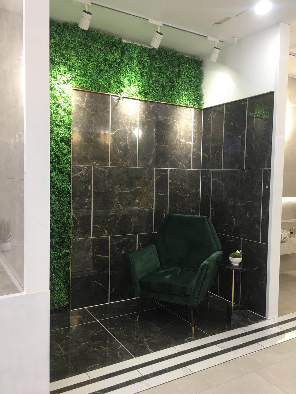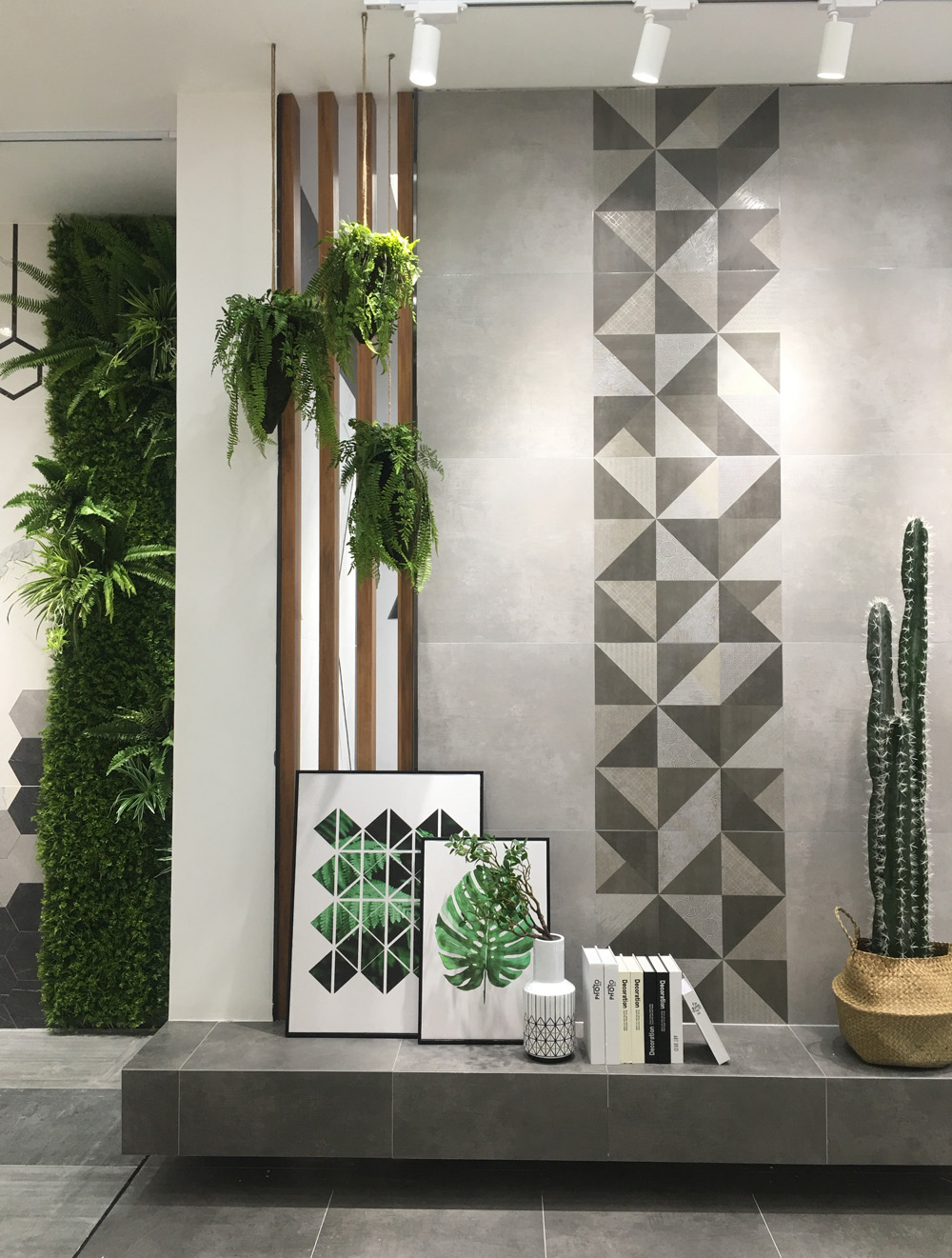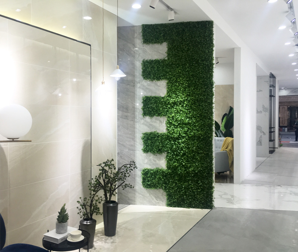 将瓷砖和绿植、水泥墙完美拼接,
