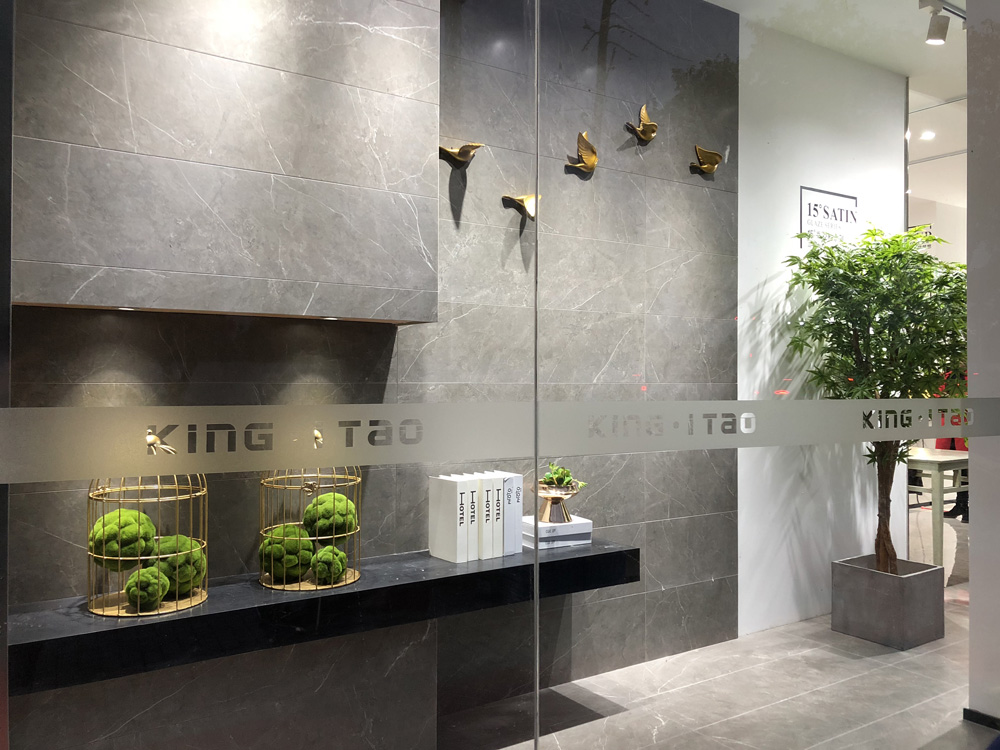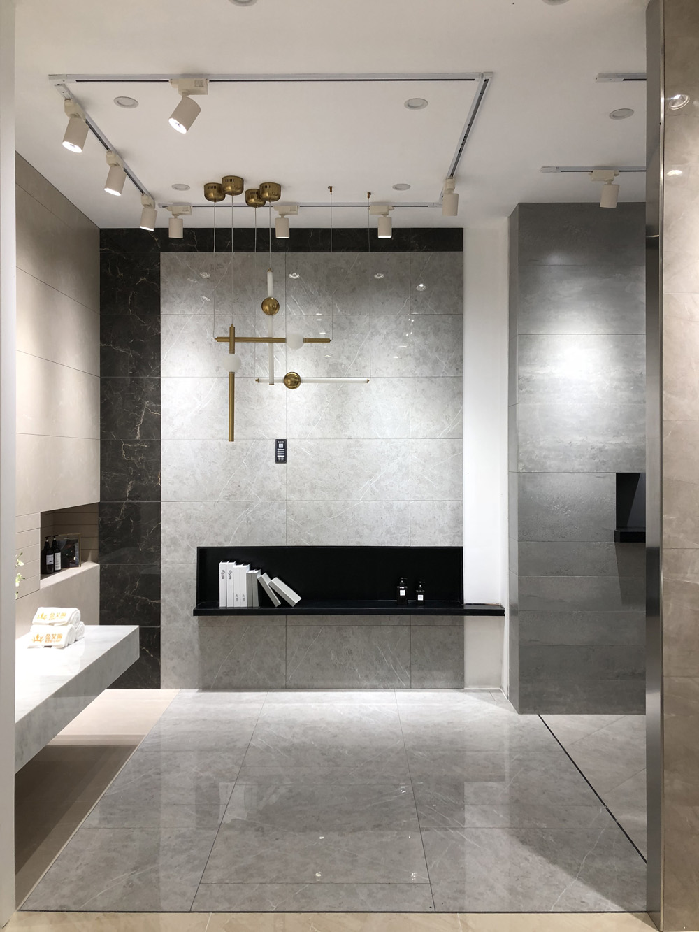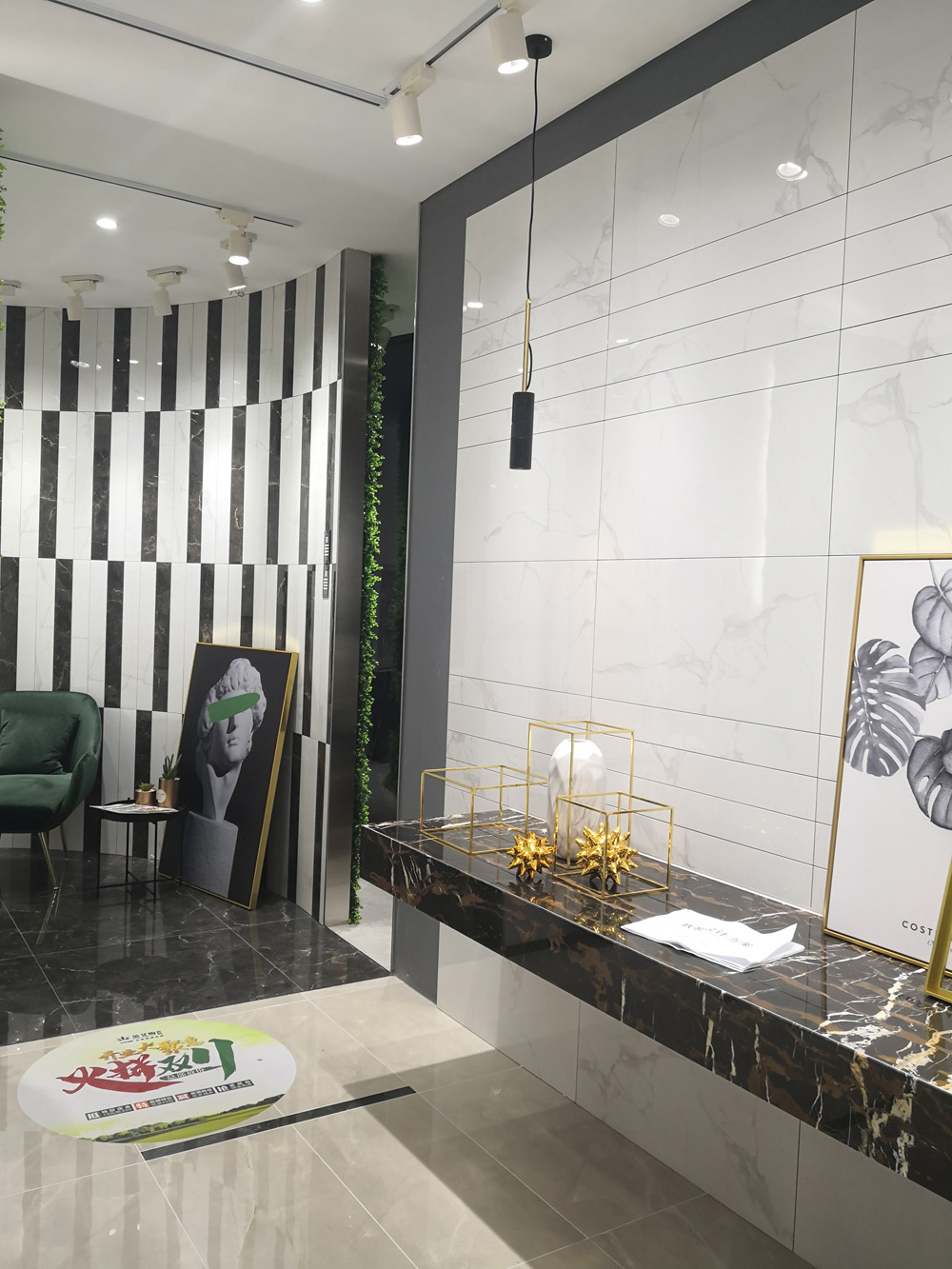 这是香蕉APP直播陶浙江嵊州青春馆的前台,由灰色九面通体大理石铺贴的背景墙,形象台由缎光釉卡拉卡白铺贴而成,可塑性非常强的一款产品。简洁大气的前台延续了青春馆的现代简约风格。