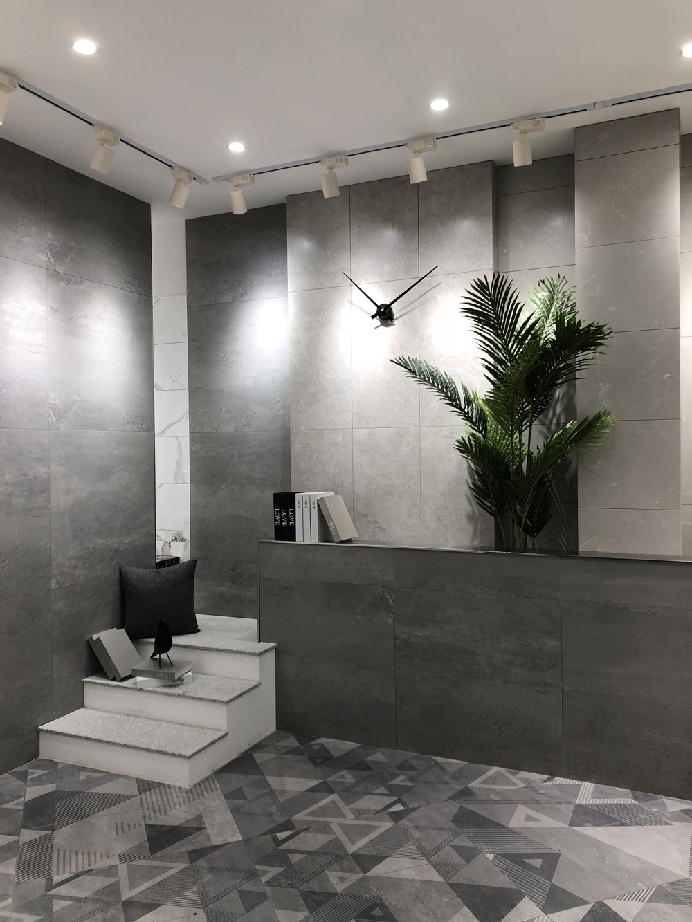 这是由缎光釉铺贴的电视背景墙、书房等,不同深度的灰色拼接搭配出简约时尚的空间。