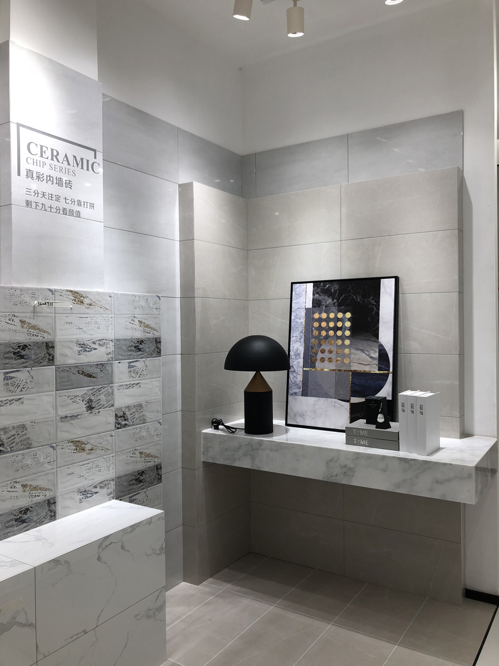 这是由喷墨瓷片铺贴的书房,突出的墙面一堵是纯色系、一堵是由花片铺贴而成,让空间有更多的变化的同时消费者也不会产生审美疲劳。