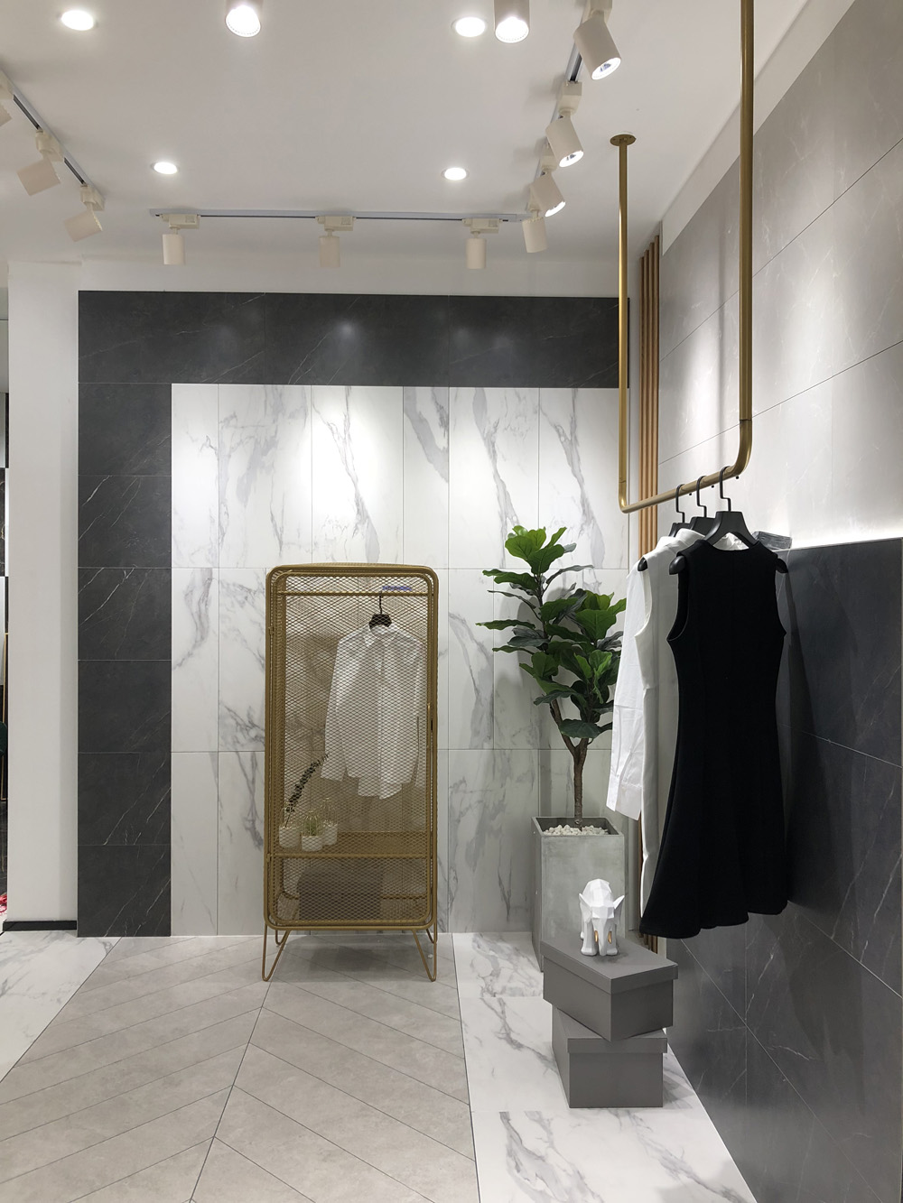 这是灰色调缎光釉铺贴的橱窗式外立面,凹凸有致,能让路人直观了解到嵊州青春馆产品的风格、花式和设计,因此橱窗的设计和产品的应用显得格外重要。