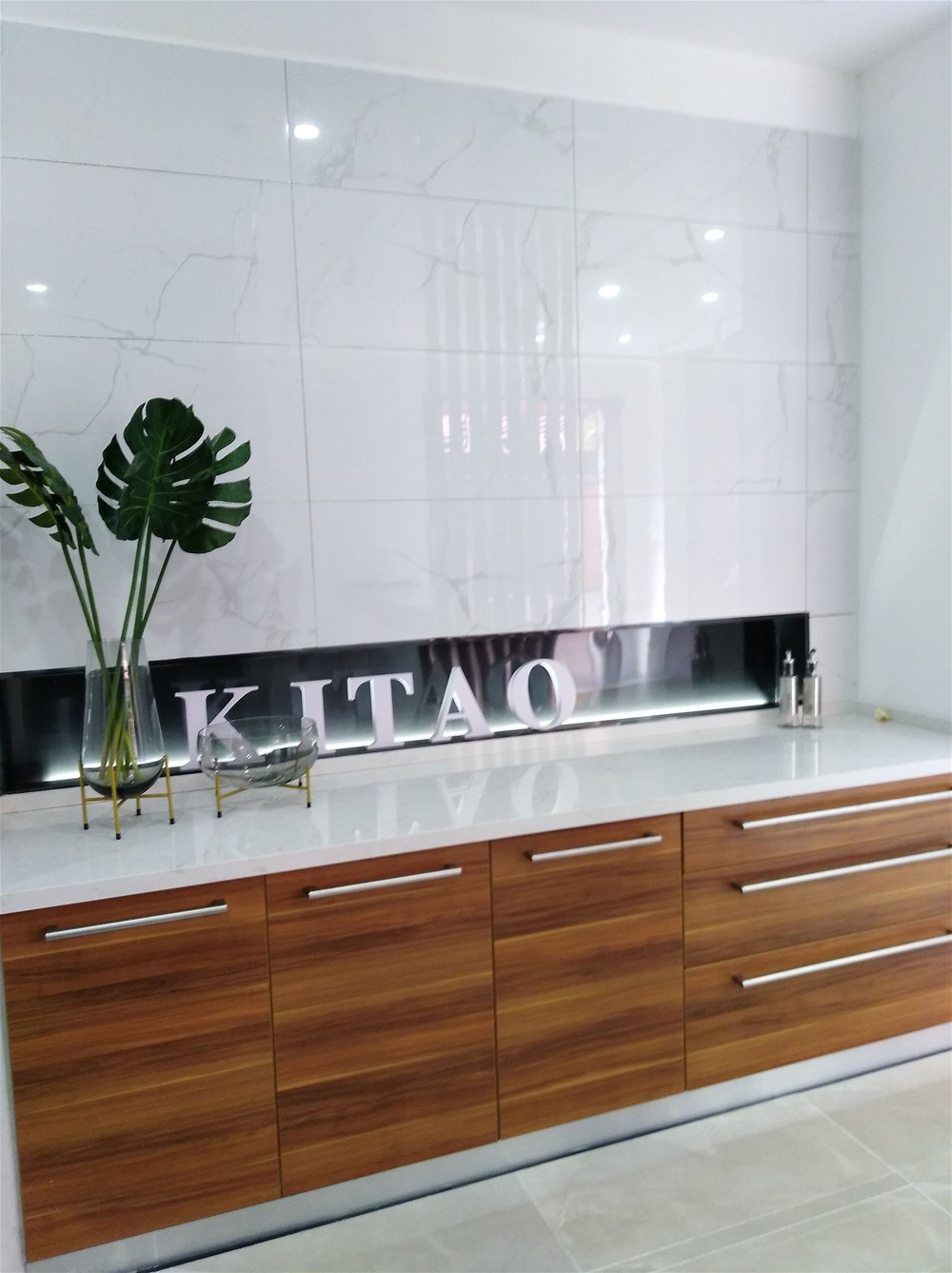 这是现代简约厨房模拟间,墙面选用九面通体大理石KA9M61205雅士白铺贴,厨房香蕉APP直播会考虑到清洁问题,选用亮面砖易于清洁,而选用白色是因为白色砖让空间看起来更宽敞明亮。
