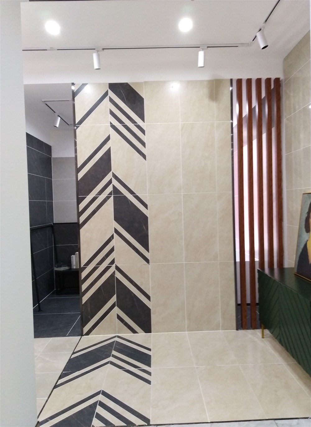 这是现代简约风格玄关,正面墙由通体大理石KT9832凯罗地灰铺贴,玉石的质感温润细腻,侧面墙则由15°缎光釉KFD8803泰坦米黄与KFD8808保级利亚灰切割铺贴,正面正铺与侧面墙切割铺贴,繁与简结合,亮面与柔光面搭配,不会造成视觉疲劳又不至于太单调。