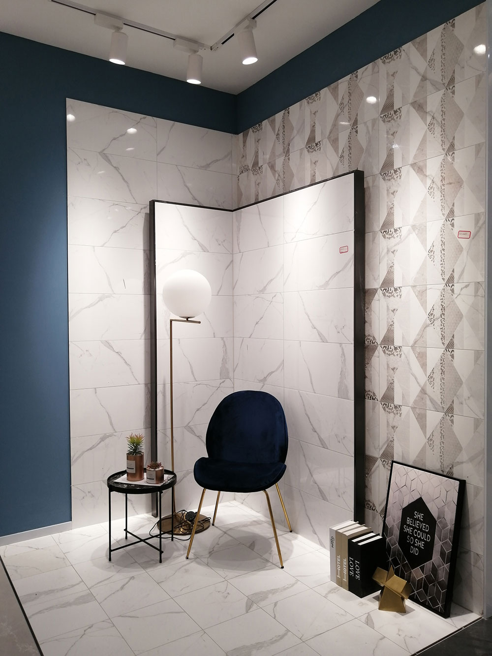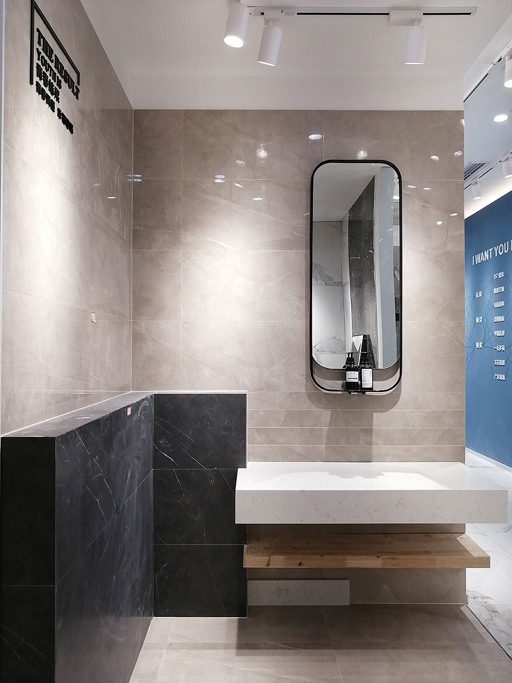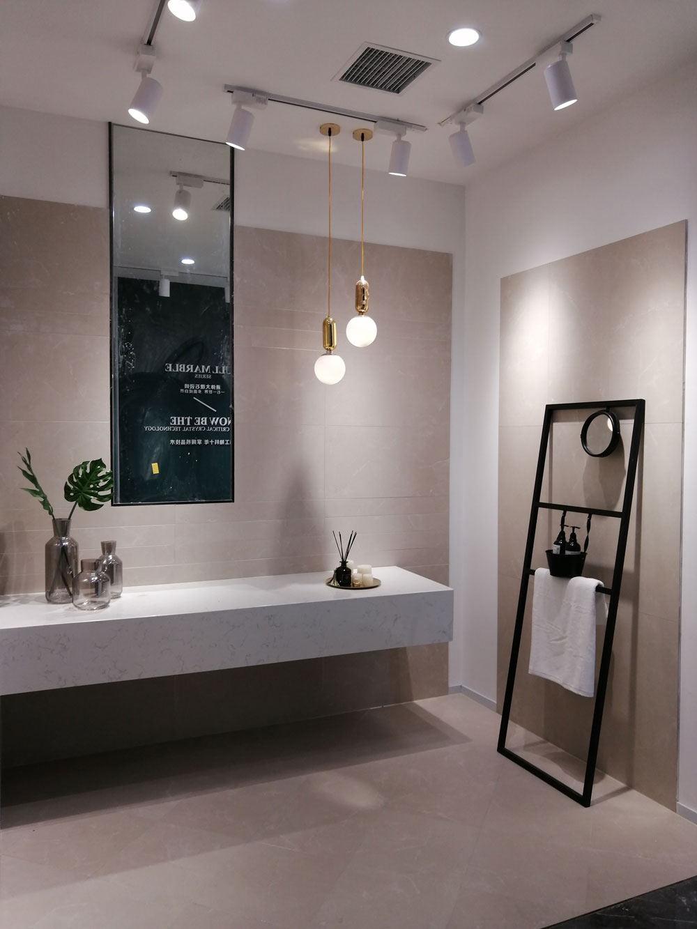 选用的是600*1200规格的通体大理石达曼深咖KTB9818/鱼肚白KAM61213,墙面的深咖色与地面的白色相呼应,营造了一种现代极简的空间感,台面上的白色加深咖色的相框让整个空间的底层白色与上层深咖色过渡的非常自然,使整个空间显得十分统一。