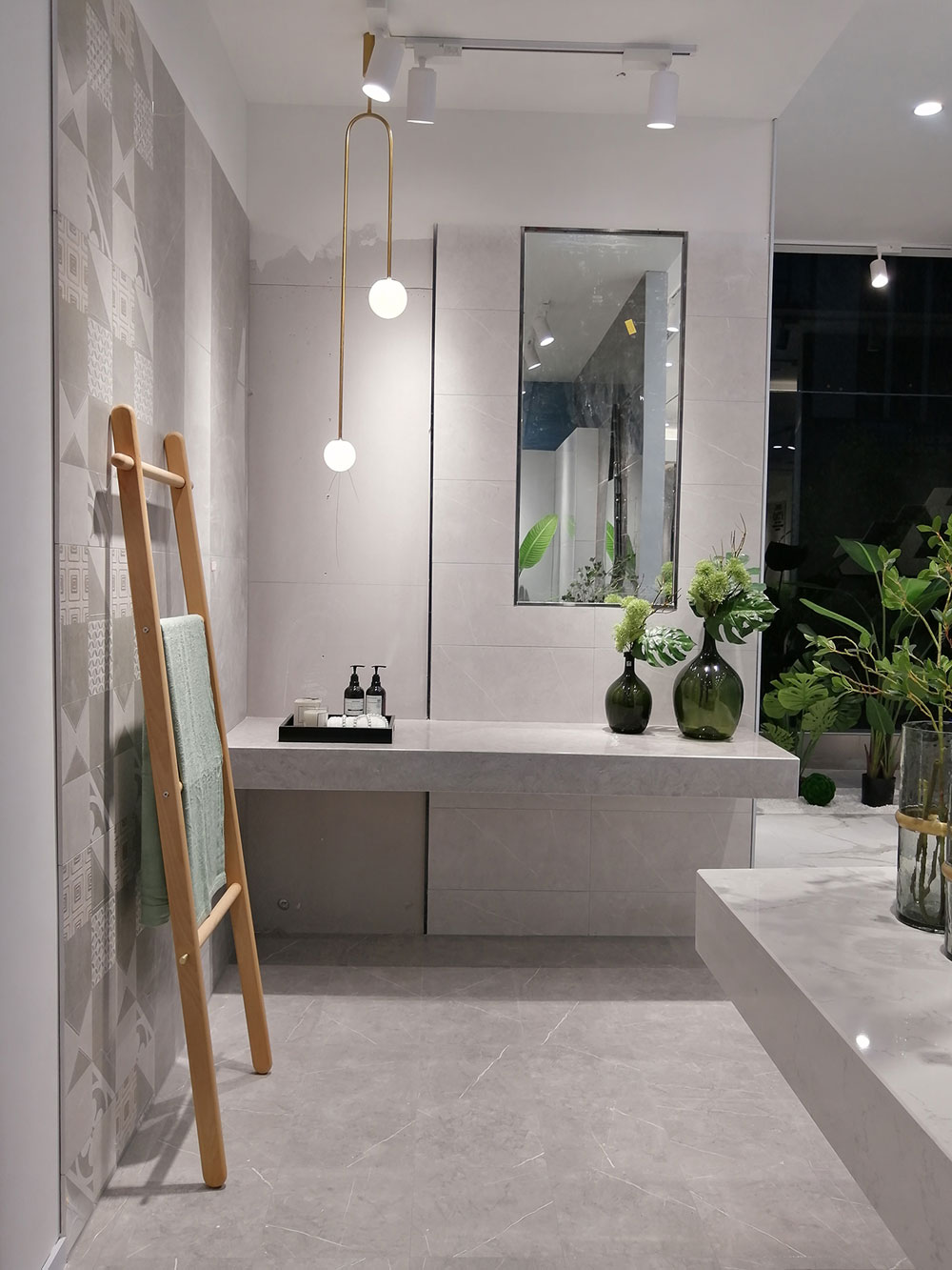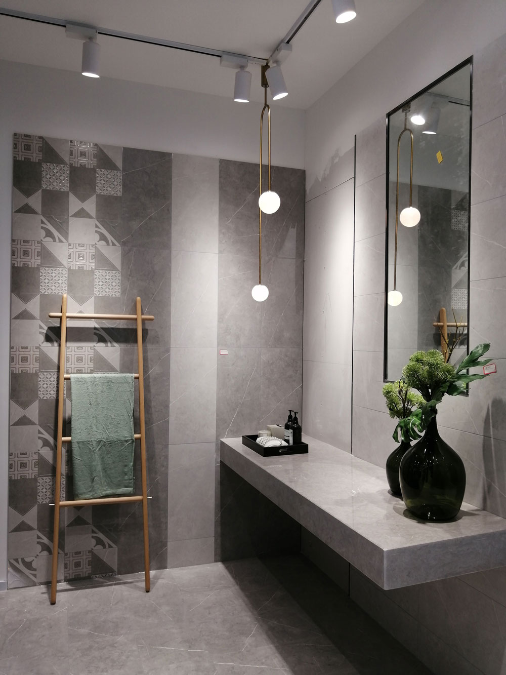 整个空间选用的是300*600规格的喷墨瓷片KPM36085,空间营造的是极简的感觉,灰色也被称为“智慧色”!整个空间采用灰色作为主色调让整个空间显得十分舒适,在搭配上植物的绿色、支架的黄色让整个空间完美融合!任何一个空间都需要一个亮点,不然整个空间都会显得空洞、乏味,在这个空间中,墙面的花纹让视线更加聚焦,是整个空间的一大亮点。