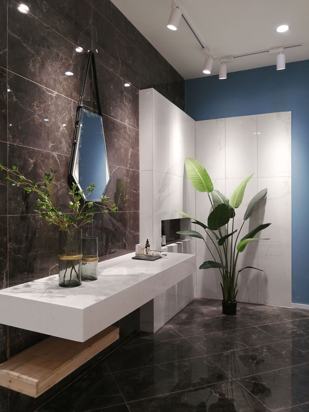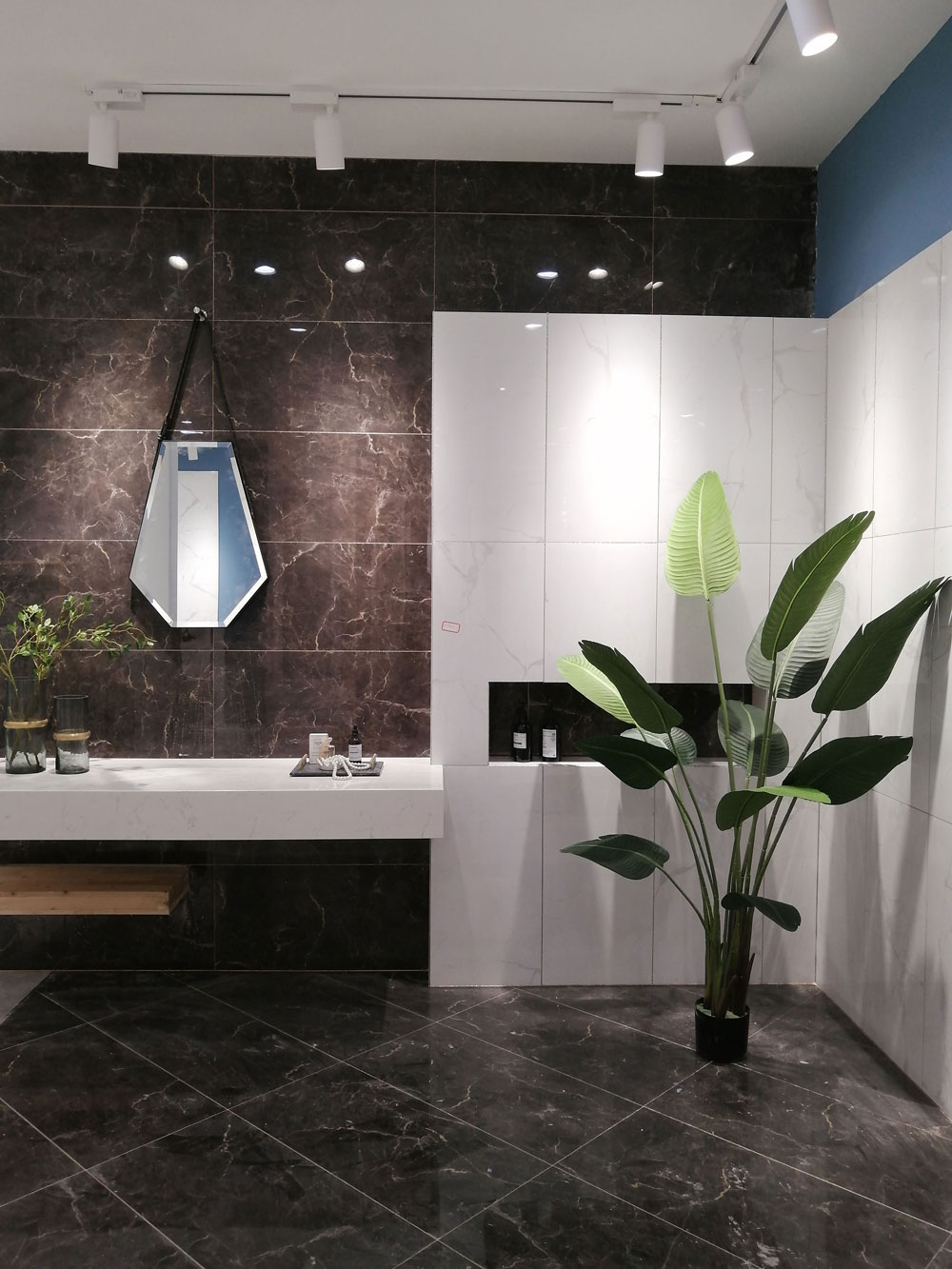 由通体大理石达曼深咖KTB9818/雪花白KTA9821切割成400*800铺贴,墙面与地面选用同一款砖,营造和谐统一的空间氛围,右边墙面选用白色瓷砖铺贴,使得整个空间层次分明,绿植点缀的空间尽显生机与活力。