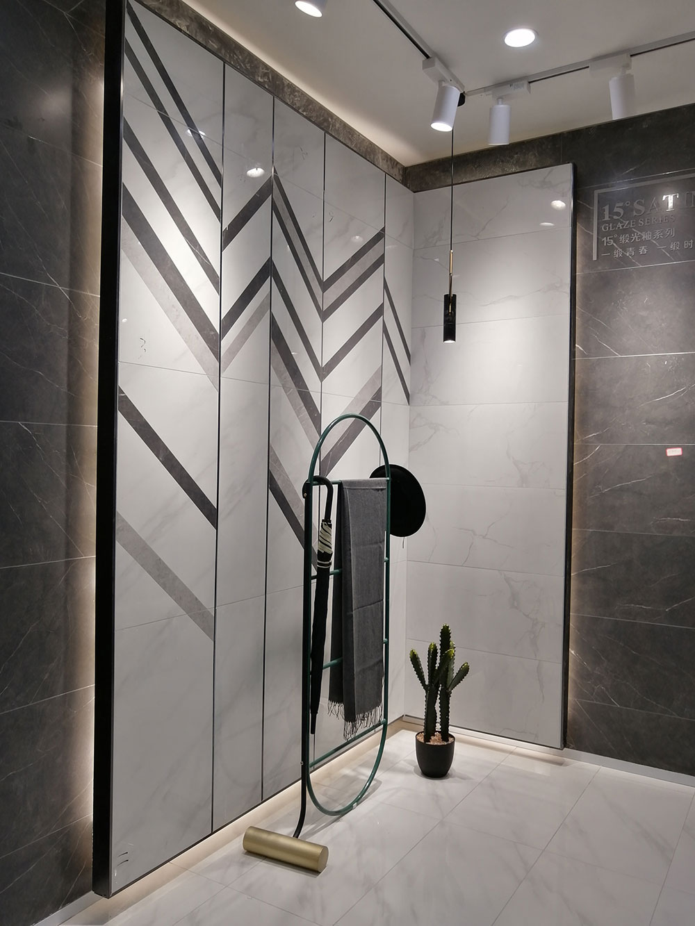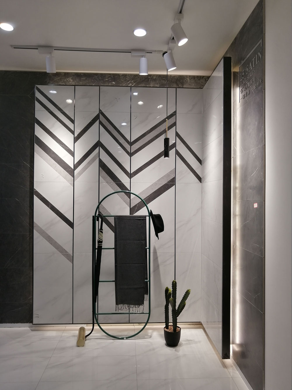 墙面是由艾釉石KYP8101水刀切割铺贴,黑白灰对比强烈,空间层次分明,区别于传统的直铺,彰显年轻人个性、大胆的需求。白色作为主色调,最有包容性的颜色,可以和任何颜色进行搭配,在这个空间,白色与灰色、黑色让整个空间富有艺术感和时尚感。