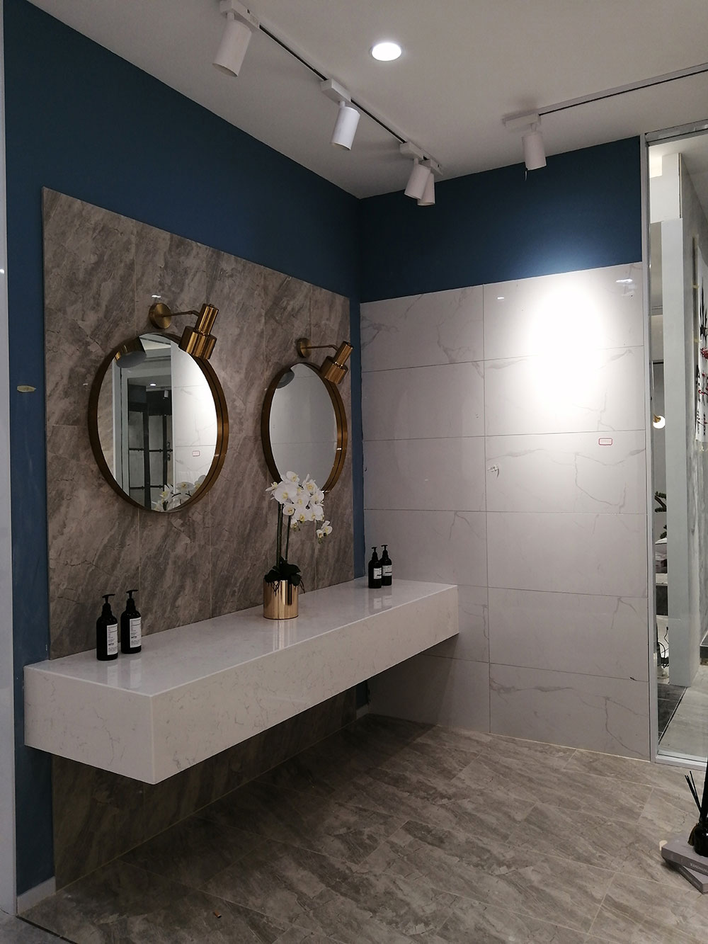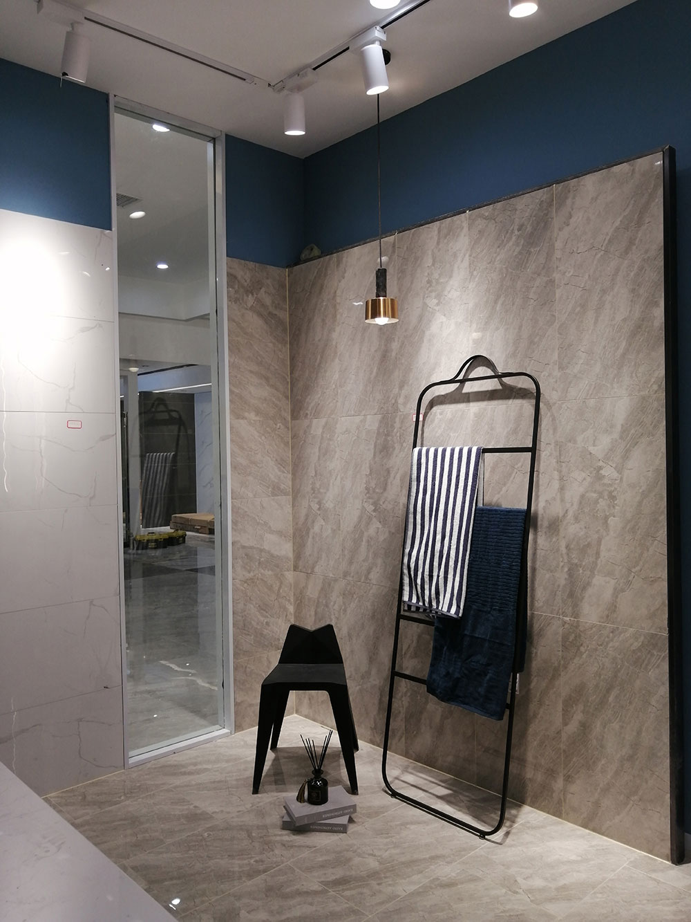 由通体大理石维纳斯灰KT9831切割后通铺,空间营造的是轻奢的感觉,整个空间大面积使用维纳斯灰,灰色是一种无极色,与黑色相搭配让整个空间体现出简单、奢华。整个空间采用了平铺,素雅的平铺更加突出砖本身的纹理与质感,返璞归真,通过细节体现品味和奢华。