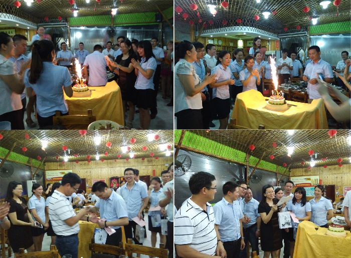 在随后的上半年庆功晚宴上,更是热闹非凡。按照一贯的传统,晚宴上还为本月的寿星举行了生日宴会,并由董事长亲自为寿星们送上生日礼物及亲笔书写的生日贺卡。