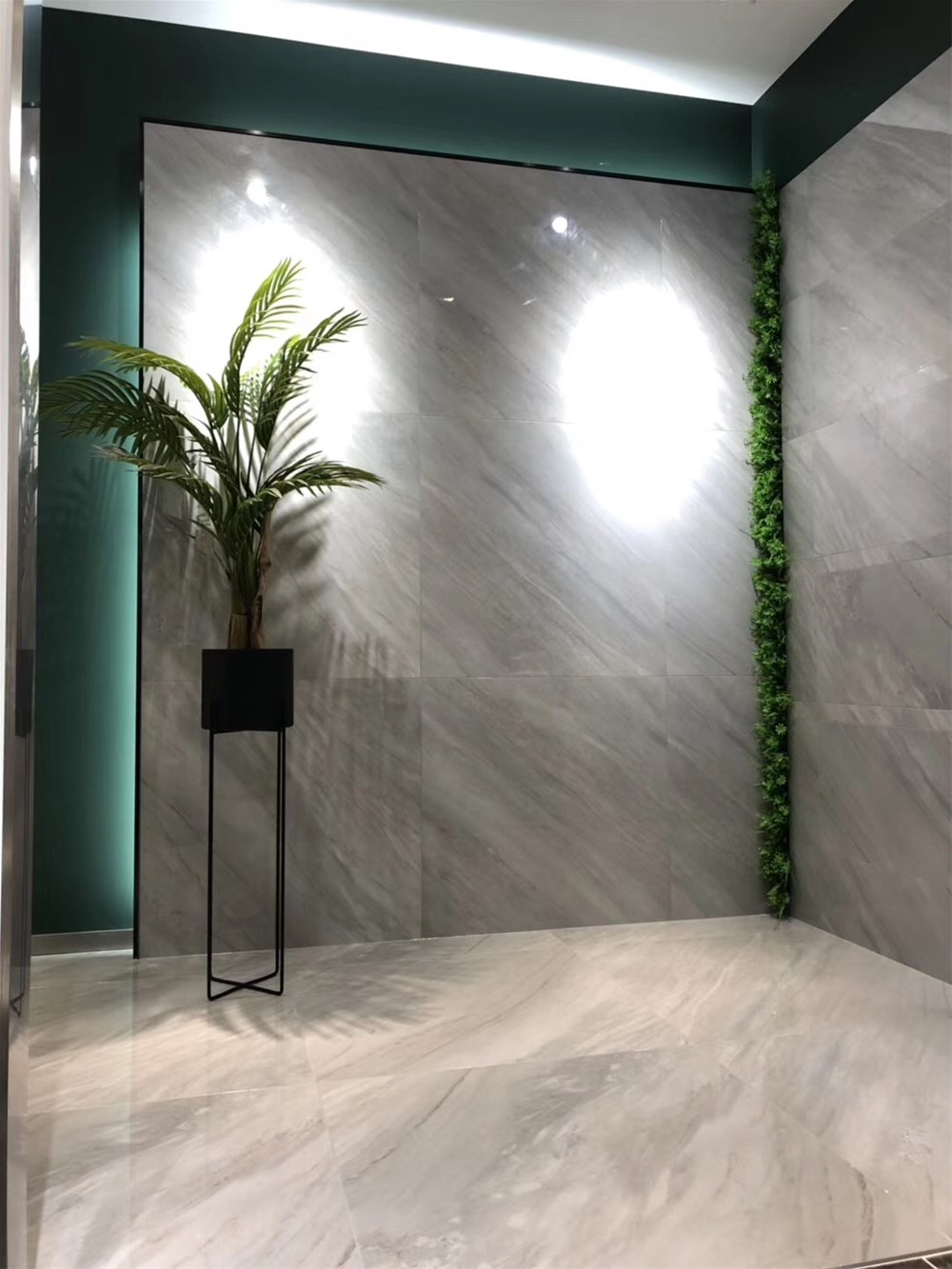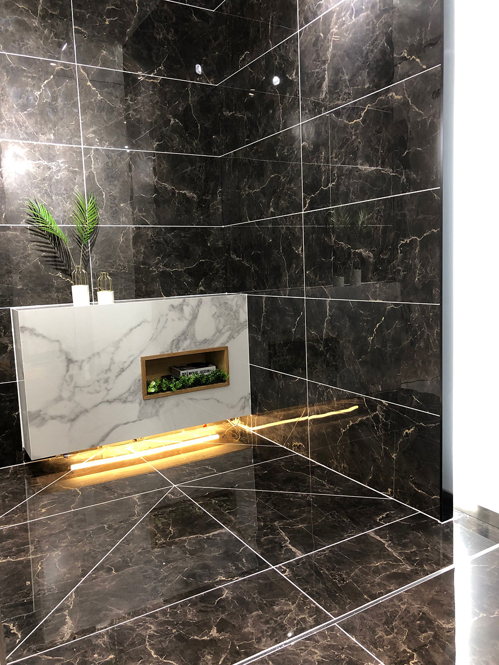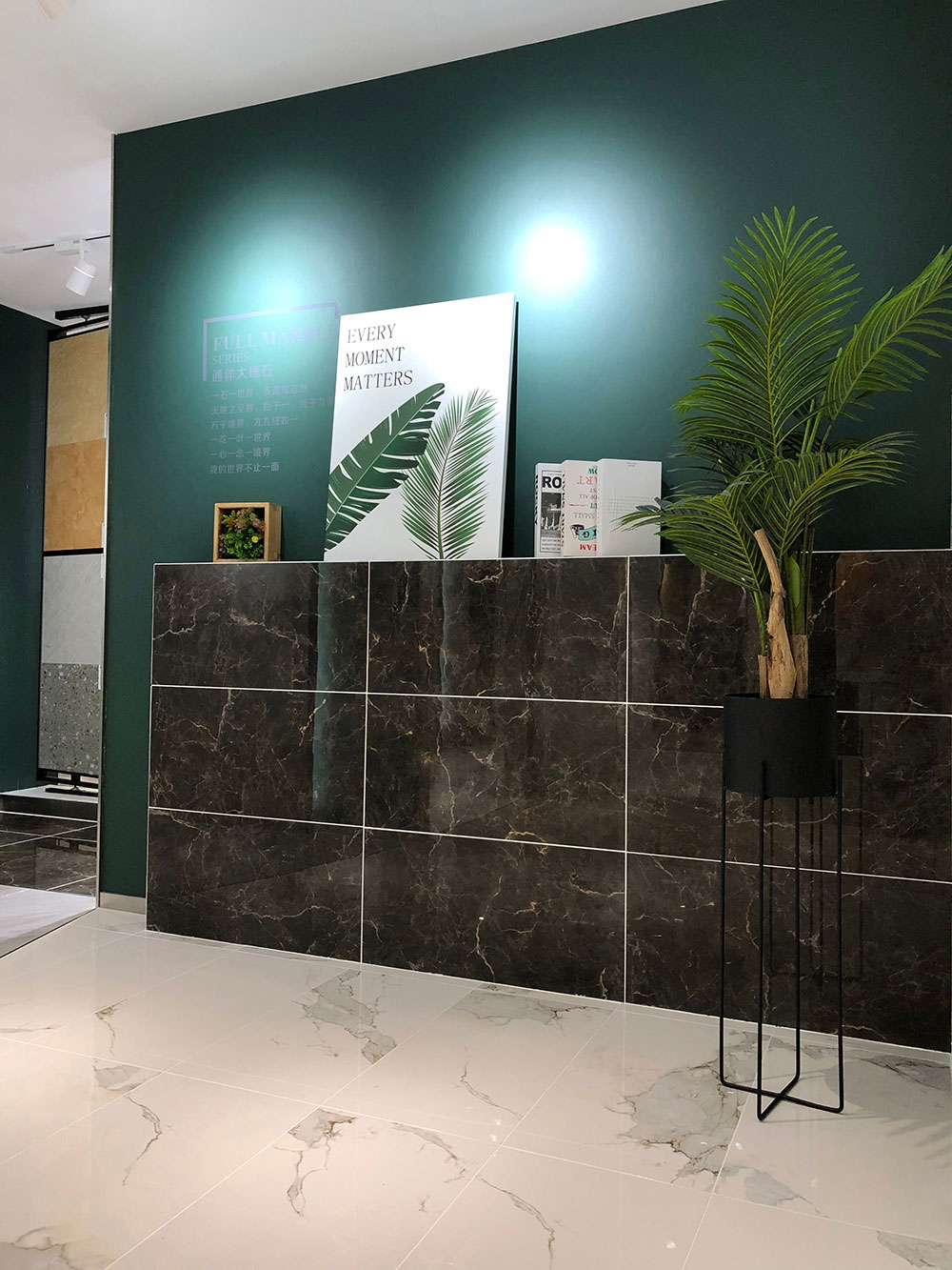 这是香蕉APP直播的前台,背景墙由灰色通体大理石KA9M009罗马布里卡通铺,把木纹条作为空间的间隔,前台选用白色镶嵌银色大理石纹,整个空间散发着简洁优雅的气息。凸显简约的香蕉APP视频污版在线定位。您家地砖和背景墙同样适合选用这款砖。