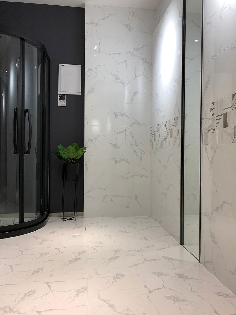 这是由配套喷墨瓷片KPM36088系列铺贴的现代简约卫生间,白色砖面镶嵌着银色纹理,墙面中间由KPM36088H作为分隔,图案简洁,整个空间营造出简约而不简单的氛围。