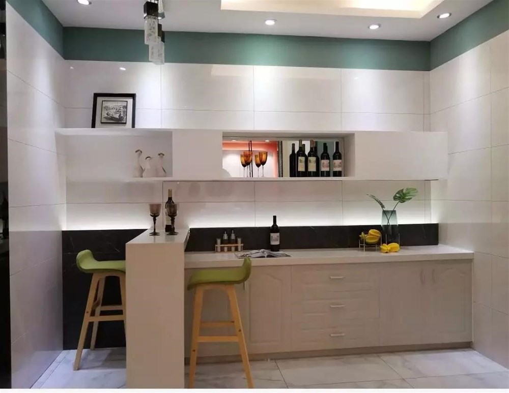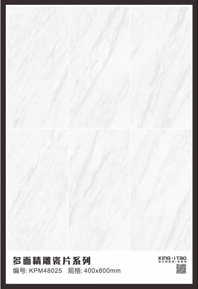 KPM48025白色飘逸的流纹作为卫生间的墙面非常干净素洁,400*800的规格显得大气美观,相对大砖切割上墙更有性价比,高光亮面让你的卫生间更显亮堂大方。洗手台用香蕉视频大全KYP918001切割当台面,900*1800规格以及大理石纹理更显档次。