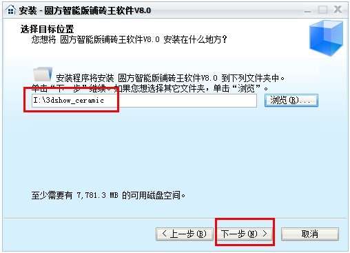 例如:假设要选择I盘,点击“浏览”,选择I盘(安装完毕后会在I盘生成3dshow_ceramic文件夹,软件的所有文件都保存在这里)