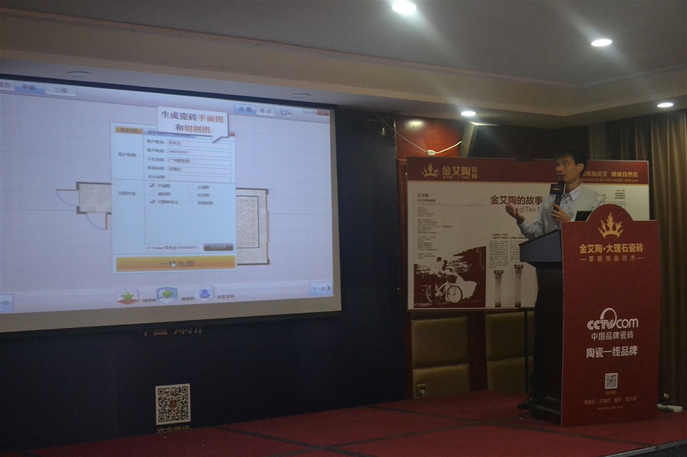 香蕉APP直播陶3D设计系统培训导师陈嘉辉为现场经销商介绍香蕉APP直播陶3D设计系统