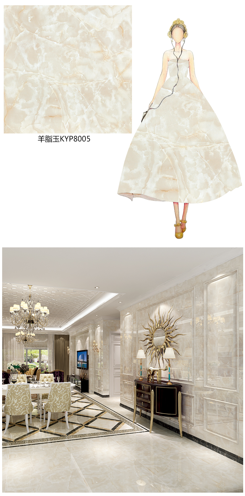 取材自天山山脉的玉石,翡翠般的光泽,宝石般的硬度,且种质细腻润泽,色调柔和,声音清脆,红光内蕴。延续了条状纹理纵贯板面的特性,白光度极好,微晶质面又极大的提升砖面立体感,加上调以温和的土黄色泽,使砖面自然清澈,纹理丝丝入扣,赋予大理石岩层肌理生机,营造出自然、洁净的生活空间。