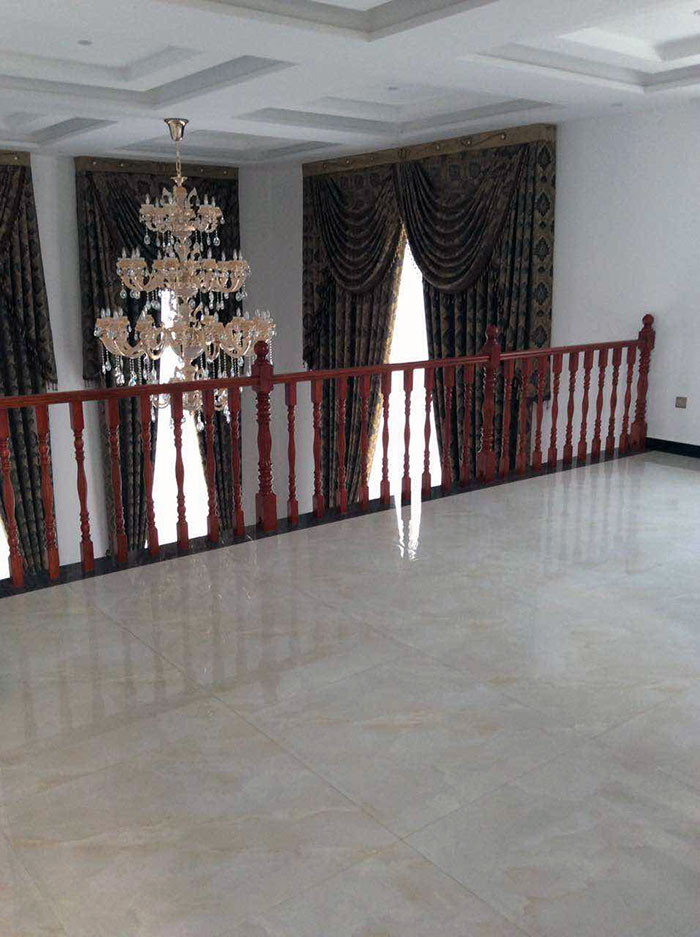 方形的天花吊顶将屋顶分割成多个回字形,中国风味浓烈的红木栏杆,无一不透漏着浓浓的中国风,精美的水晶吊灯和窗帘的运用,为整个空间增添了一丝新意,整个空间虽少了诸多奢华的元素,却更加流畅地表达出传统文化中的精髓。