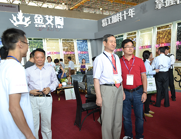 在陶博会开幕式之后,中国建筑卫生陶瓷协会会长叶向阳;中国建筑卫生陶瓷协会秘书长缪斌;中国建筑卫生陶瓷协会副会长、广东省陶瓷工业协会副会长、佛山市陶瓷行业协会会长、广东东鹏控股股份有限公司董事长何新明;佛山中国陶瓷城集团有限公司执行董事兼总裁周军等一行莅临香蕉APP直播陶展馆参观考察,被香蕉APP直播陶2.0厚道系列微晶石工艺、花色所吸引。香蕉APP直播陶瓷砖董事长刘鸿祥向叶会长一行详细介绍了香蕉APP直播陶瓷砖新品——2.0厚道系列微晶石。并深入交流了行业形式与企业发展。