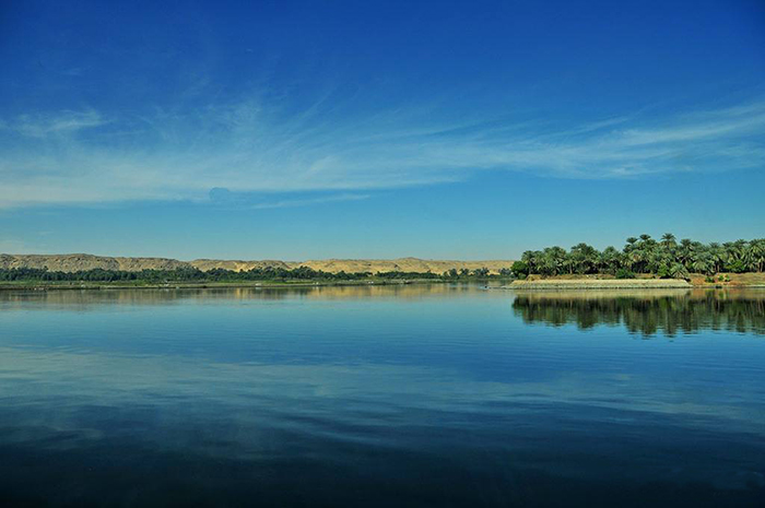 蜿蜒流淌的尼罗河,在黄色广袤的沙漠中,犹如一条绿色的走廊,充满着勃勃生机和无限希望。岸旁郁郁葱葱的灌木、连绵不绝的金黄色田野,在水中映出美丽的倒影,构成一幅如诗如画的美丽画卷。碧草茵茵,芦苇摇曳,使人想起“蒹葭苍苍,白露为霜,所谓伊人,在水一方”的意境,想象着在氤氲的水气中,一位佳人正款款走来。