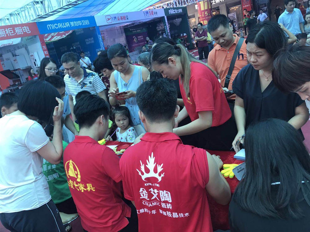 据了解,此次商场联盟活动优惠力度非常诱人,吸引了不少客户进场参与活动,其中香蕉APP直播陶的临时展位更是人头汹涌,进店客户络绎不绝,工作人员都忙得不可开交,香蕉APP直播陶瓷砖香蕉APP视频污版在线战略运营部副总经理兼广东大区经理蔡伟鹏也到现场为活动助力,帮忙接待客户,为客户带去专业的搭配、铺砖知识。